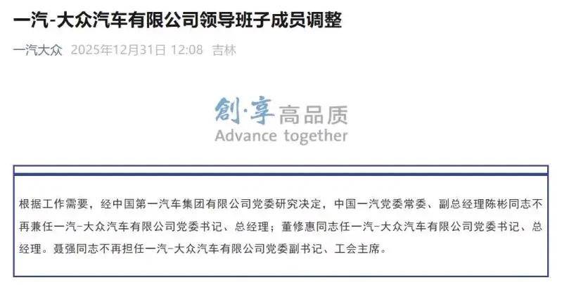 2025年的最后一個工作日,一汽集團接連扔下人事換防“重磅炸彈”。