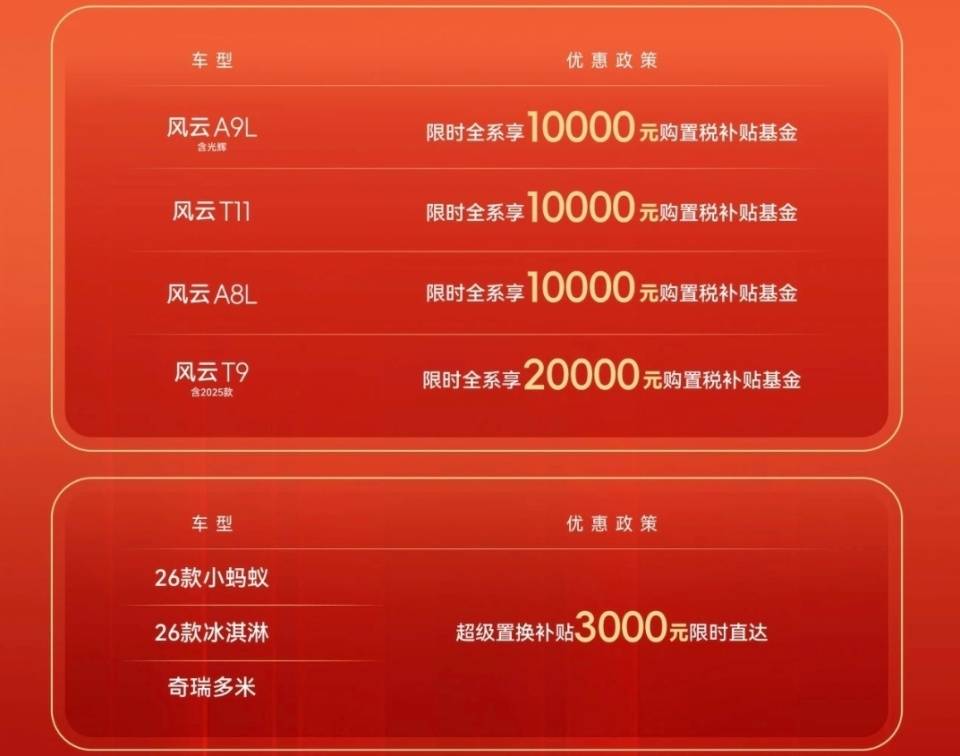 包括風云T11在內,購置稅補貼基金最低都是1萬元,意味著基本是全免了。