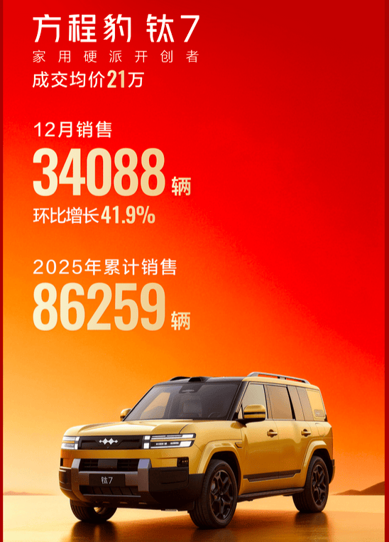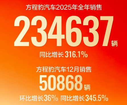 3.4萬是什么概念呢?那就靠著這款均價20萬的鈦7,方程豹品牌已經(jīng)連續(xù)5個月銷量暴漲,在2025年最后一個月不僅更助力方程豹品牌單月銷量突破5萬大關,同比暴漲345.5,還使得方程豹智己排進了新勢力月銷榜單的前三名。