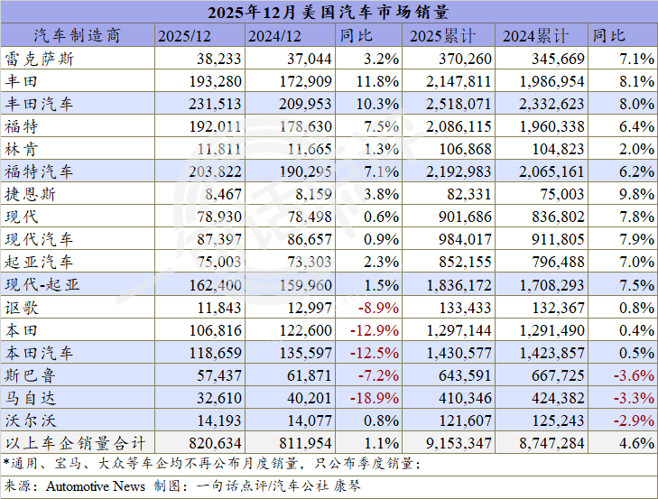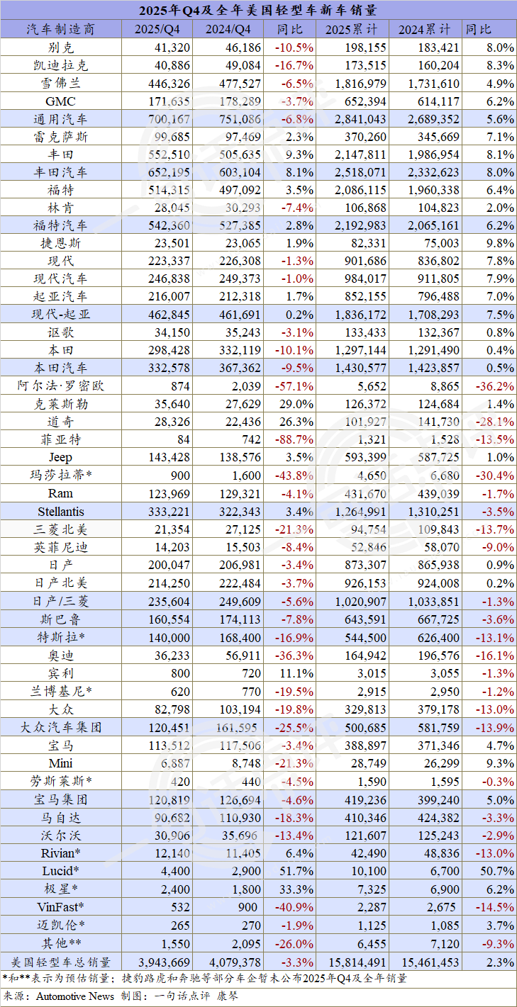 Autonews統(tǒng)計(jì)的已公布數(shù)據(jù)的大多數(shù)車企表現(xiàn)來看,雖然3個(gè)月的連續(xù)下跌導(dǎo)致四季度的銷量僅收于394.4萬輛,跌幅為3.3%,但得益于前三季度同比分別增長4.8%、2.7%和6.1%,因此2025年美國輕型車新車市場(chǎng)同比仍增長2.3%,銷量約為1581.4萬輛。
