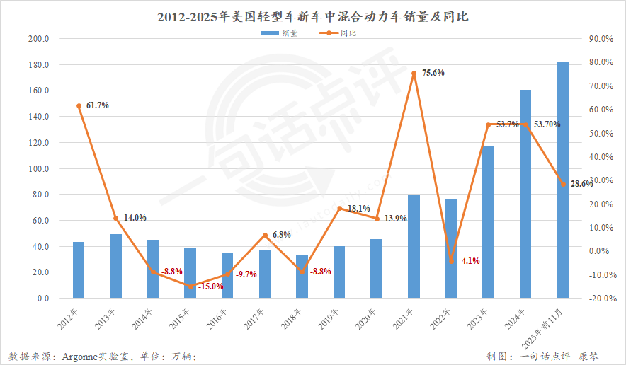 根據(jù)Argonne的統(tǒng)計(jì)數(shù)據(jù),2025年前11個(gè)月美國共售出182.0萬輛混合動(dòng)力車,已超過2024年全年的160.9萬輛。