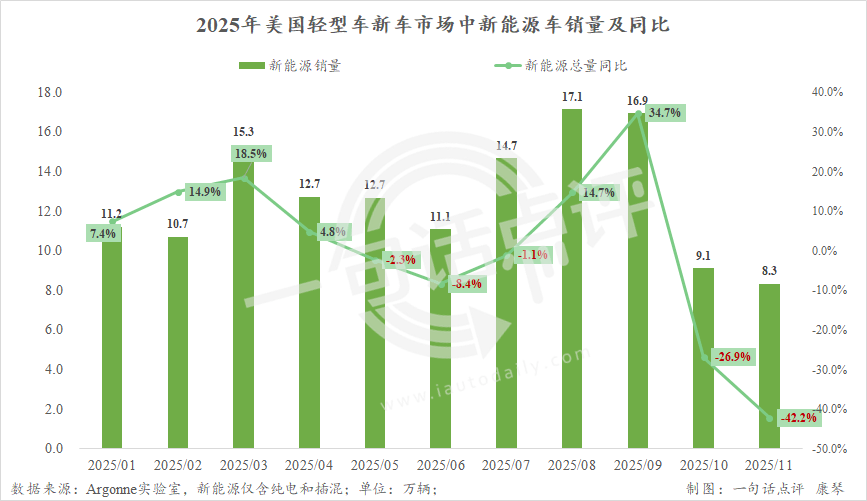 同時(shí),該機(jī)構(gòu)的數(shù)據(jù)顯示,去年10月開始美國電動(dòng)車銷量已陷入大幅走跌,10月同比下跌26.9%至9.1萬輛,11月下跌42.2%至8.3萬輛。