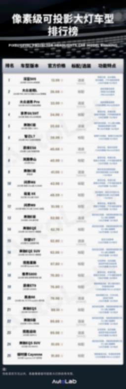 在榜單上搭載這一技術的車型,其像素級可投影大燈具備單顆130萬像素,整套大燈系統像素共計260萬的能力。