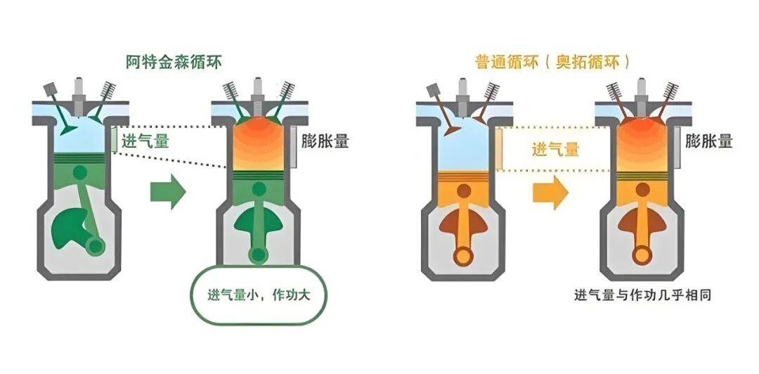 阿特金森循環和奧托循環一樣,也是基于四沖程發動機的原理工作起來的。兩者不同的是,奧托循環的工作步驟是實打實的吸進多少空氣就壓縮多少、燃燒多少,每一次做功都按固定步驟完成。而阿特金森循環的關鍵在于改變進氣門關閉的時機,它會在活塞上行壓縮的前半程延遲進氣門關閉,讓部分空氣回流到進氣道,相當于壓縮時輕松了一些。