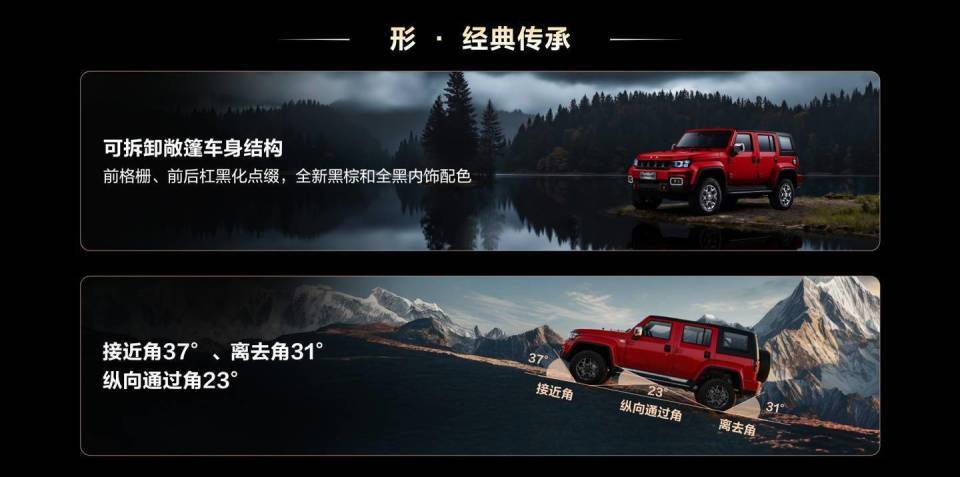 標志性的五孔格柵、LED光圈大燈和隧道式尾燈構成了車輛的高辨識度前臉。更為獨特的是,這款車采用了同級唯一的可拆卸硬頂與開式車身設計,通過簡單的操作就能從硬派越野變身為敞篷車,滿足了用戶對多元場景的需求。