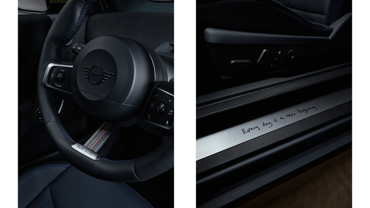 Paul Smith的標(biāo)志性彩色條紋元素,在車(chē)上以克制而精巧的方式呈現(xiàn):駕駛員側(cè)車(chē)頂彩色亮眼條紋、方向盤(pán)10色編織帶、儀表臺(tái)立體暗紋織物……這些細(xì)節(jié)如同隱藏的彩蛋,在方寸之間展現(xiàn)設(shè)計(jì)功力與美學(xué)態(tài)度。解鎖時(shí)地面投射手寫(xiě)體“Hello”,腳墊暗藏手繪幸運(yùn)兔,迎賓踏板刻“Every day is a new beginning”,所有簽名、手寫(xiě)體元素均為原廠獨(dú)立編號(hào)零件。為了保留這份手寫(xiě)的溫度與獨(dú)特性,MINI工程師甚至為此開(kāi)發(fā)了專屬零部件,并承諾即使未來(lái)車(chē)型停產(chǎn),相關(guān)零部件也將持續(xù)供應(yīng)至少12年。