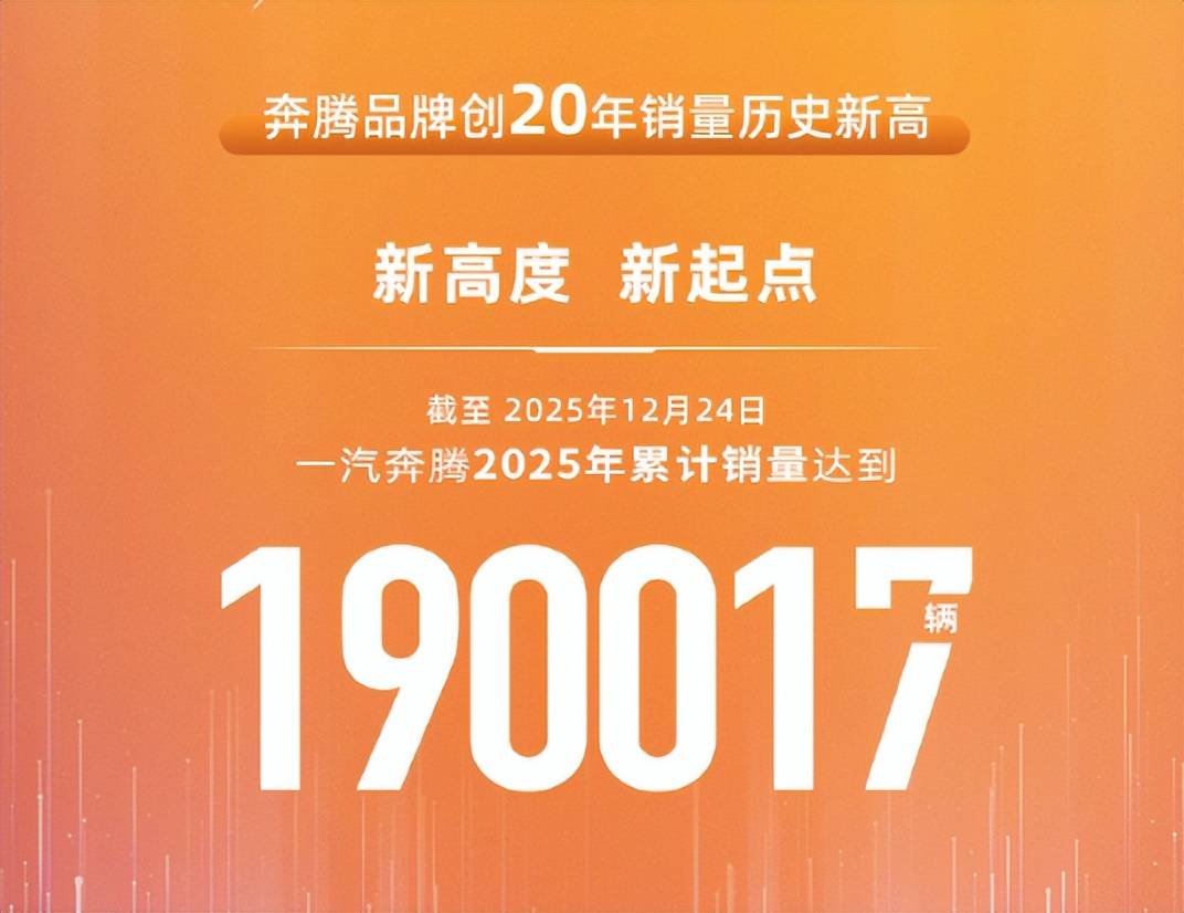 進入2026年1月份,各大車企紛紛公布了去年的銷量數據。而在2025年12月24日,一汽奔騰官方已經迫不及待地公布出累計銷量已突破19萬輛。同時,2026年1月4日,中國一汽的官網上發布一汽奔騰2025年銷量超20萬輛,創20年歷史新高。