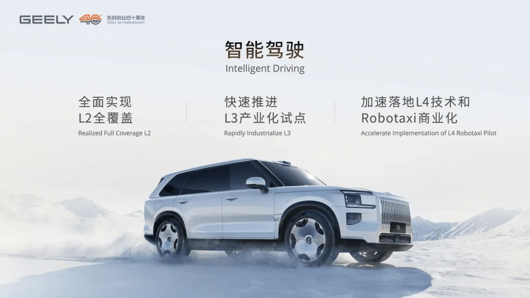 更值得玩味的是,吉利對智能駕駛的表述也很“硬”:它要把“千里浩瀚”做成全球最先進的技術平臺,實現L2全覆蓋、推進L3產業化試點,并加速L4與Robotaxi的商業化落地;