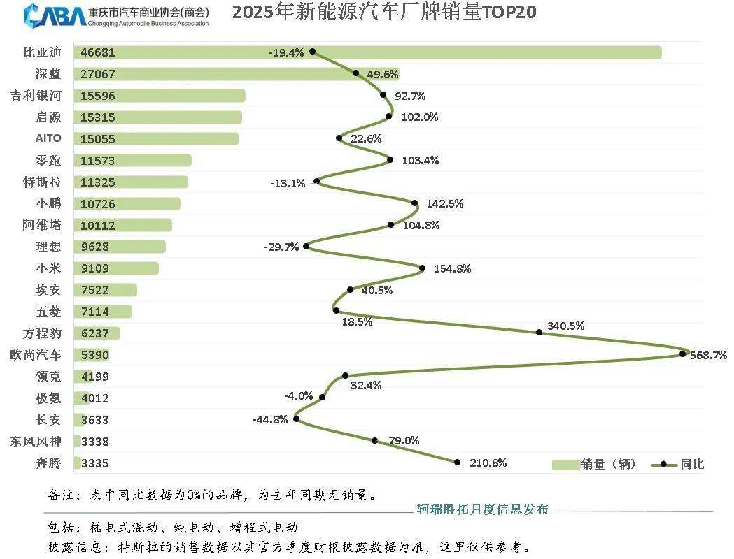 在重慶2025年新能源汽車廠牌銷量TOP20中,盡管比亞迪銷量超4.66萬輛,坐穩第一,但同比下滑19.4%的數據,讓廠家壓力不小。