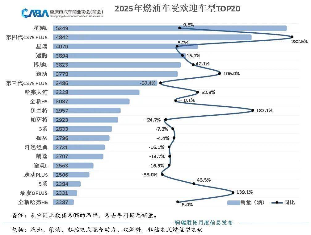 2025年重慶燃油車受歡迎車型TOP20中, 前三排名被星越L、第四代CS75PLUS、星瑞獲得。其中,第四代CS75PLUS同比增長為282.5%,從這能看得出重慶消費者對于本土品牌還是情有獨鐘的。