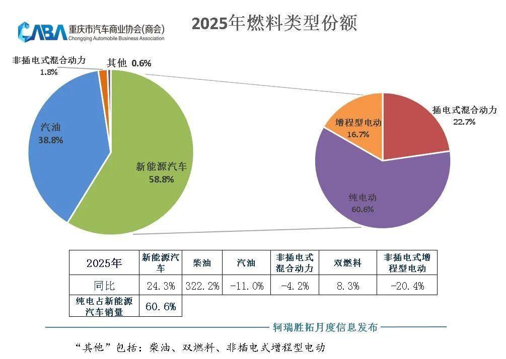 從2025年銷售車型的燃料類型來看,重慶市場燃油車銷量占比為38.8%,相比上年進一步下滑。具體來看, 新能源汽車銷量占比達到58.8%,其中,純電車型占比為60.6%。