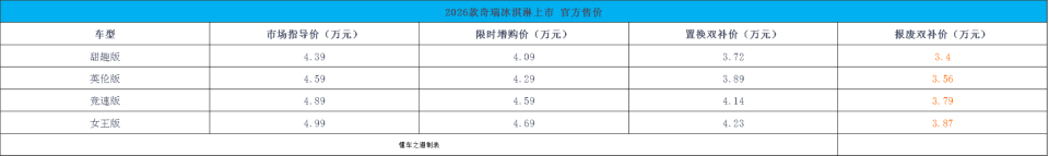 1月10日,2026款奇瑞冰淇淋上市,新車共計推出4款車型,市場指導價4.39-4.99萬元,報廢雙補價3.4-3.87萬元,甜趣版、英倫版、競速版、女王版四種車型采用了不同風格的外觀設計,滿足用戶的個性化需求。動力方面,采用純電動力系統,其電機最大功率30千瓦,最大扭矩90牛·米,純電續航里程220km,支持22kW快充,30%-80%充電33分鐘,CLTC純電續航220km。新車具備的4米轉彎半徑、坡輔+蠕行模式功能。