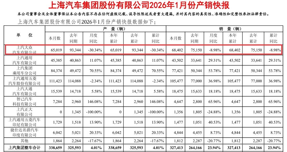 同比下滑8.98%,上汽大眾,2026開年首月銷量68402臺