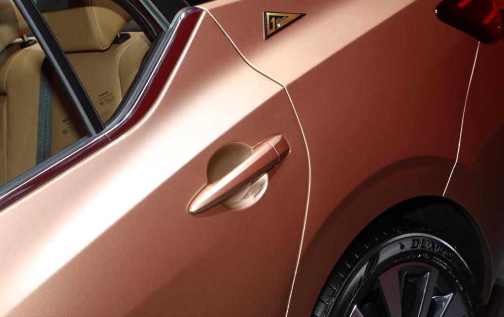不過說實話,念寒認為軒逸貼上這個三角徽章之后,確實起到了畫龍點睛的作用。因為徽章采用黑底金字的配色,與金日出金的側身和曜石黑的的車頂色漆,形成了非常鮮明的對比,增加了一種獨特的視覺效果。周圍的車漆在燈光下閃耀,展現了光滑的表面處理和高品質的材料。