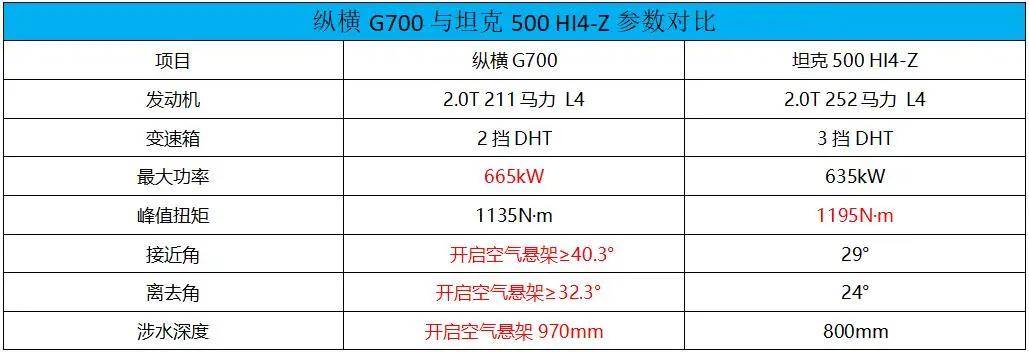 在這其中,坦克500 HI4-Z與后來者縱橫G700顯然是佼佼者,消費者想要購買一臺國產高端方盒子時,這兩臺車是繞不過去的選擇。二者究竟誰更稱得上國民全領域出行之王,本文將選擇縱橫G700乾崑版(頂配)與坦克500 HI4-Z智享版(頂配)進行對比,從越野能力、駕乘體驗、配置多寡、智駕表現等層面來論述,看看誰更能滿足消費者全場景下的用車需求。