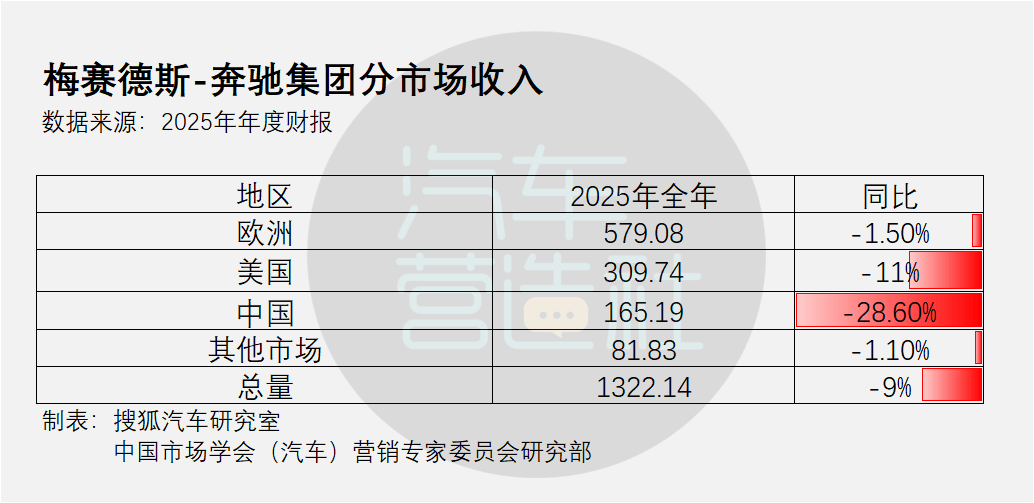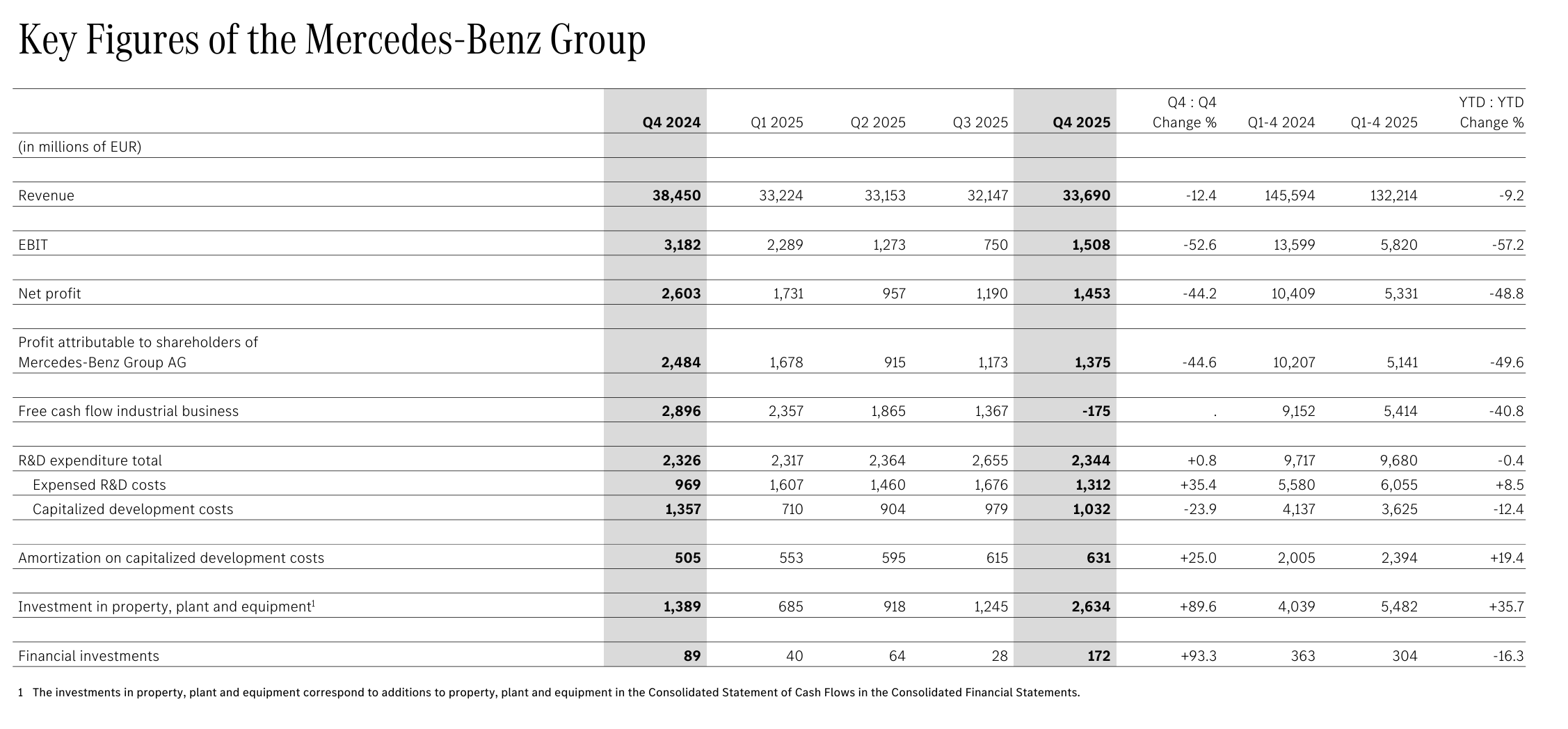 2026年2月12日,梅賽德斯-奔馳集團發布2025年度財報。受全球市場需求疲軟、電動車業務虧損及中國市場競爭加劇等多重因素影響,財報表現呈現出明顯的承壓態勢,核心營收指標出現顯著下滑。財報表現顯著低于2024年同期,但符合奔馳集團在之前發布的預期。