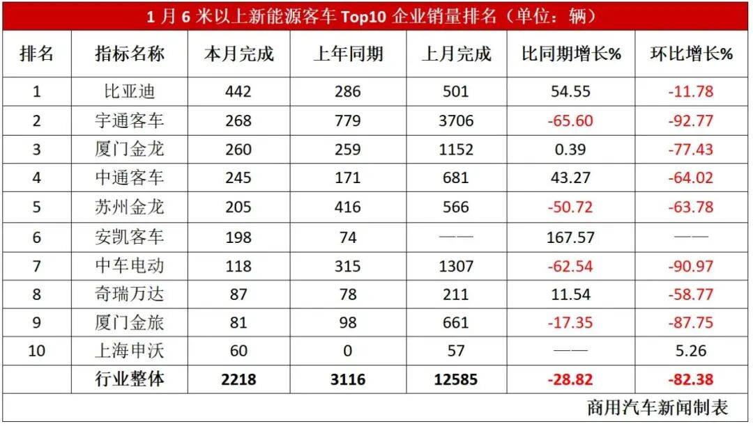 同比來看,1月Top10“6升4降”。比亞迪、廈門金龍、中通客車、安凱客車、奇瑞萬達、廈門金旅、上海申沃7家企業(yè)跑贏了大盤。由于同期基數(shù)較低,安凱客車漲幅最大,同比增長167.57%,領跑行業(yè)。