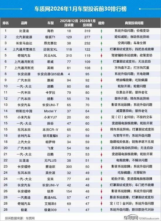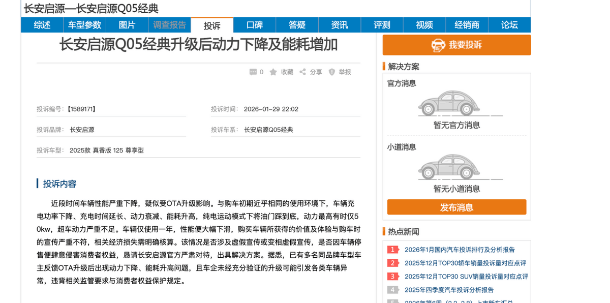 2月初,車質網發布2026年1月車輛投訴榜單,根據榜單顯示,以95起投訴,直接沖到了榜單第八名!從去年12月份的4起,到今年1月份的95起,可以說是增長非常迅速,而且這些投訴幾乎清一色指向一個問題——OTA升級后被偷偷限制功率。這次投訴潮波及面還挺廣,2023到2025款的Q05經典基本都中招了,不少車主都是去年12月被推送了OTA升級,升級完直接懵圈。
