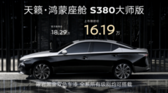 天籟·鴻蒙座艙S380大師版上市限時價為16.19萬元。外觀采用曜巖黑金雙拼色車身及曜夜黑紅內飾。