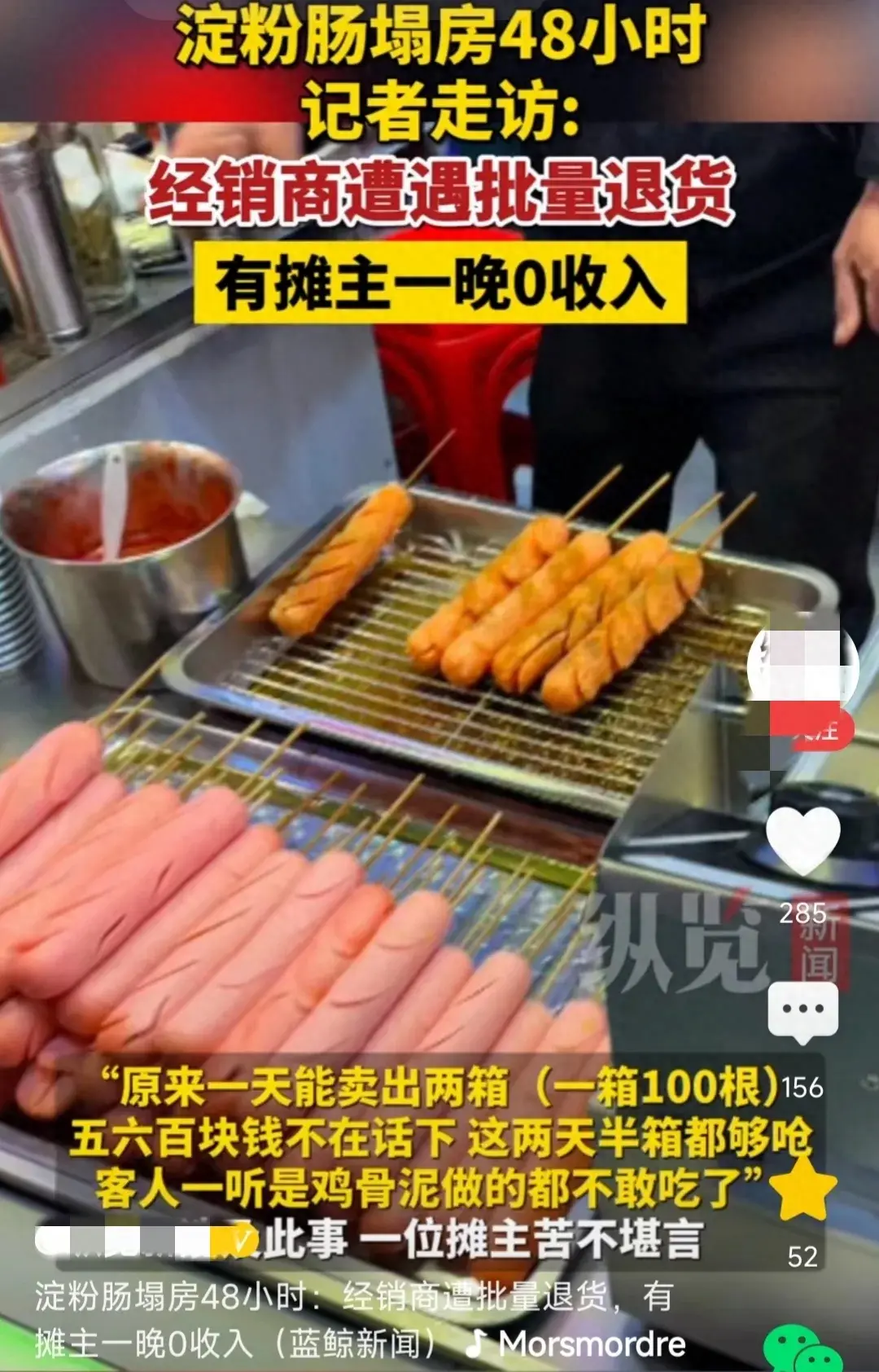 攤主說:“315以前,賣淀粉腸生意火爆,基本每天都能賣幾百根,靠賣淀粉腸養(yǎng)家糊口沒問題,現(xiàn)在一個也賣不掉了,不知道以后咋辦了”,可能要去做下一個生意了。