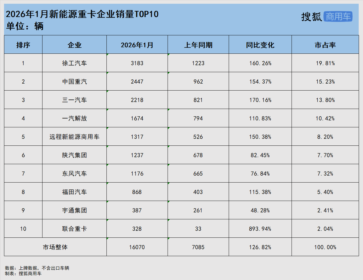 排名第十的聯合重卡,在奇瑞集團的賦能下,市場表現搶眼,1月銷售新能源重卡328輛,同比暴漲893.94%,市占率2.04%,這一增幅不僅領跑行業前十企業,也延續了之前的跨越式增長態勢。面向2026年1.2萬輛銷量目標,聯合重卡已經升級電麒麟系列產品、推出 800V電鳳凰等新品,產品矩陣更加完善,有望成為新能源重卡市場的新晉潛力選手。