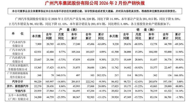 3月2日,廣汽集團(tuán)發(fā)布2026年2月份產(chǎn)銷快報(bào)。數(shù)據(jù)顯示,2026年2月份,廣汽集團(tuán)銷量為86452輛,同比下降12.43%,今年1-2月份,廣汽集團(tuán)累計(jì)銷量為203074輛,同比增長(zhǎng)3%。