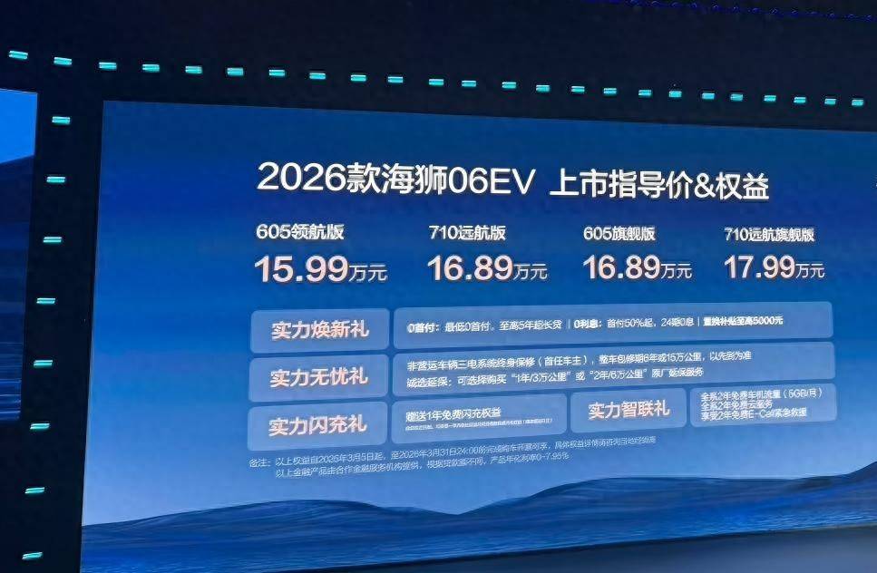 3月4號,2026款海獅06 EV正式上市,售價15.99-17.99萬元,作為中期改款車型,新車的部分車型搭載了兆瓦閃充,最高純電續航也增加至(CLTC)710km,而且還可以花9900元加裝激光雷達,升級到天神之眼B的智駕系統。