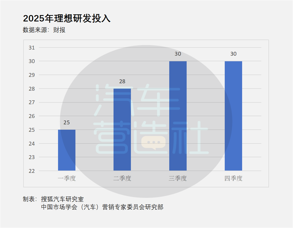一家公司在利潤承壓時最誠實的動作,往往不是口號,而是預算。在過去一年中,盡管銷量和利潤持續(xù)承壓,但理想每個季度的研發(fā)費用基本穩(wěn)定在28億元左右,甚至三、四季度持續(xù)加碼,并沒有因為營收的下降而“節(jié)衣縮食”。