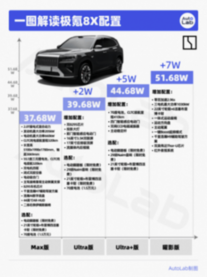 這次極氪8X一共推出了四款車型,MAX/Ultra/Ultra+以及曜影版,預售價分別為37.68/39.68/44.68和51.68萬元。