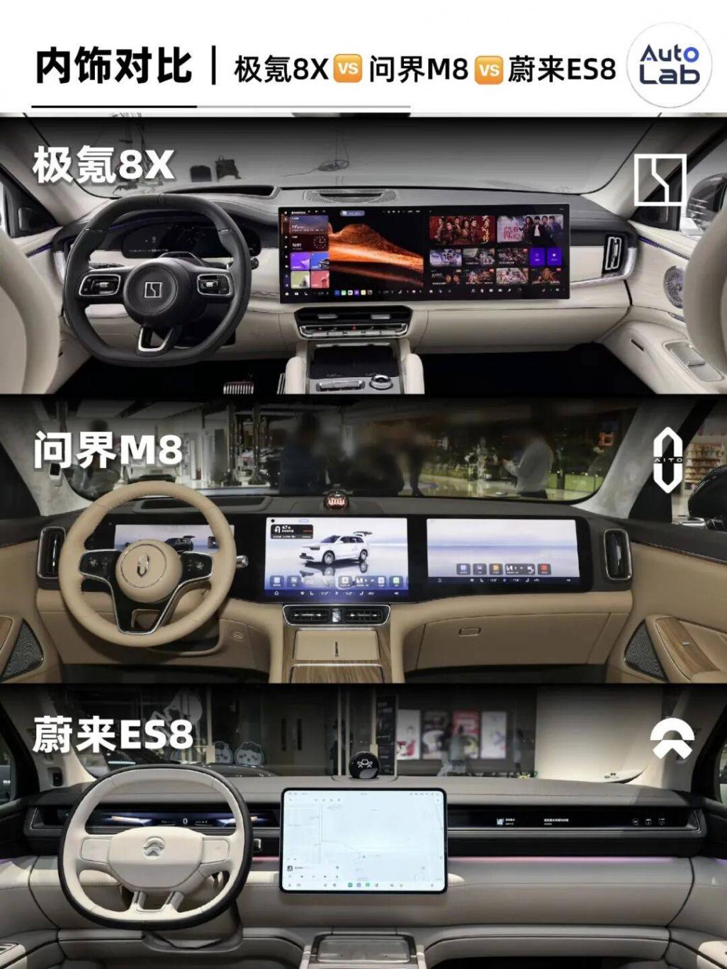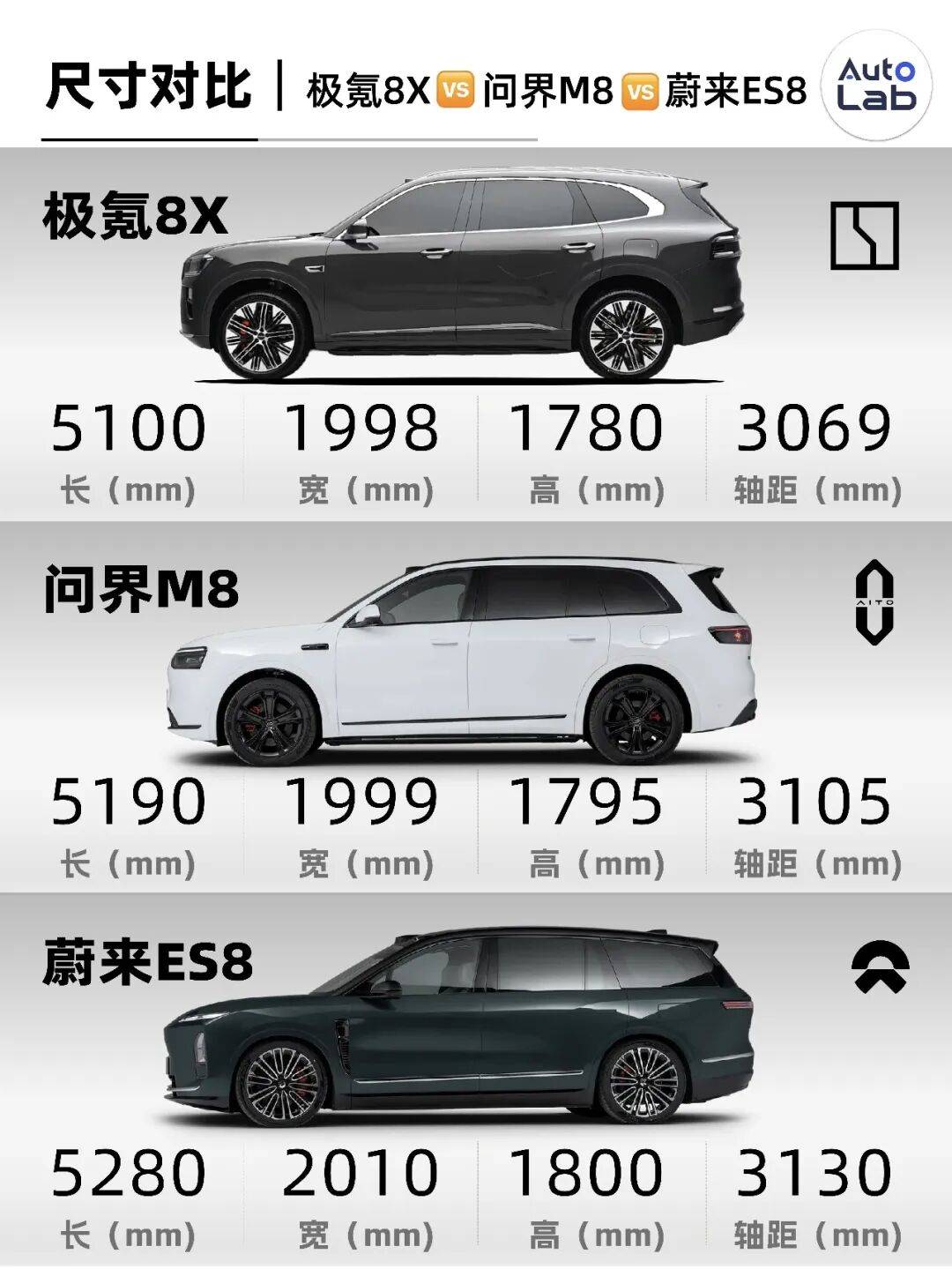 目前市面上叫“8”的SUV不少,我們挑了最熱門的兩臺——問界M8和蔚來ES8,跟極氪8X放一起看一看。