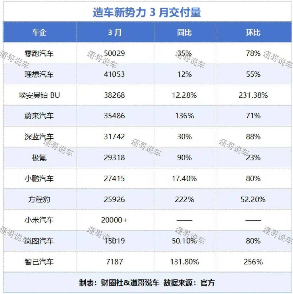 4月1日,多家造車新勢力按“慣例”公布3月交付量成績。《財圈社&道哥說車》編輯統計了部分造車新勢力以及傳統車企創二代的3月交付量成績,發現這部分車企普遍實現銷量同比、環比雙增長。