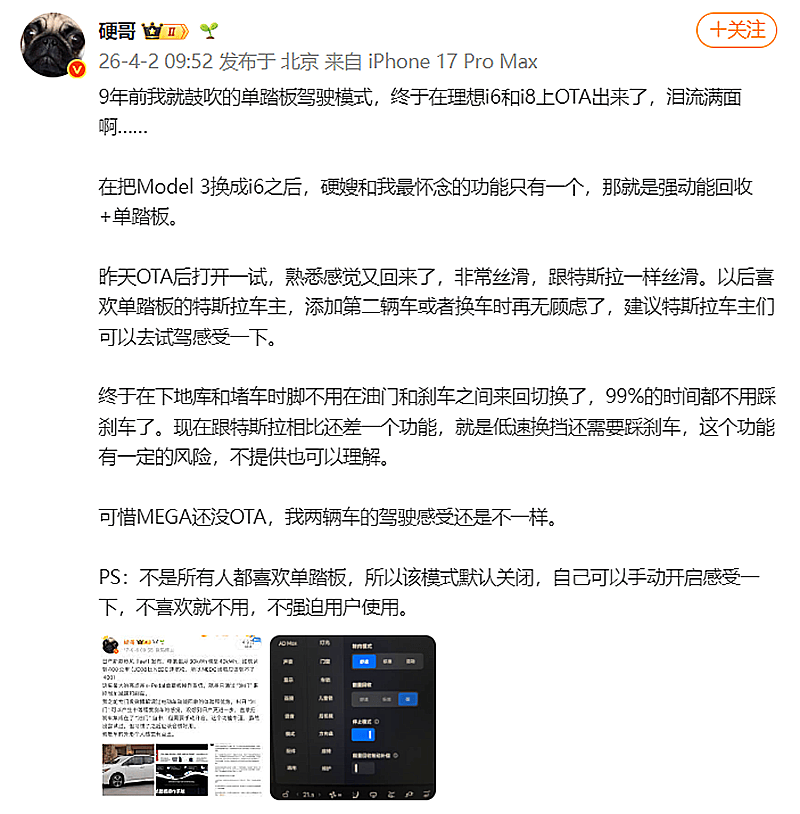 內容稱、i8兩款電動汽車通過OTA方式推出了“單踏板模式。”并且其稱理想汽車的單踏板模式非常絲滑,跟特斯拉一樣絲滑;以后喜歡單踏板模式的特斯拉車主,添加第二輛車或者換車時再無顧慮,建議特斯拉車主去試駕。