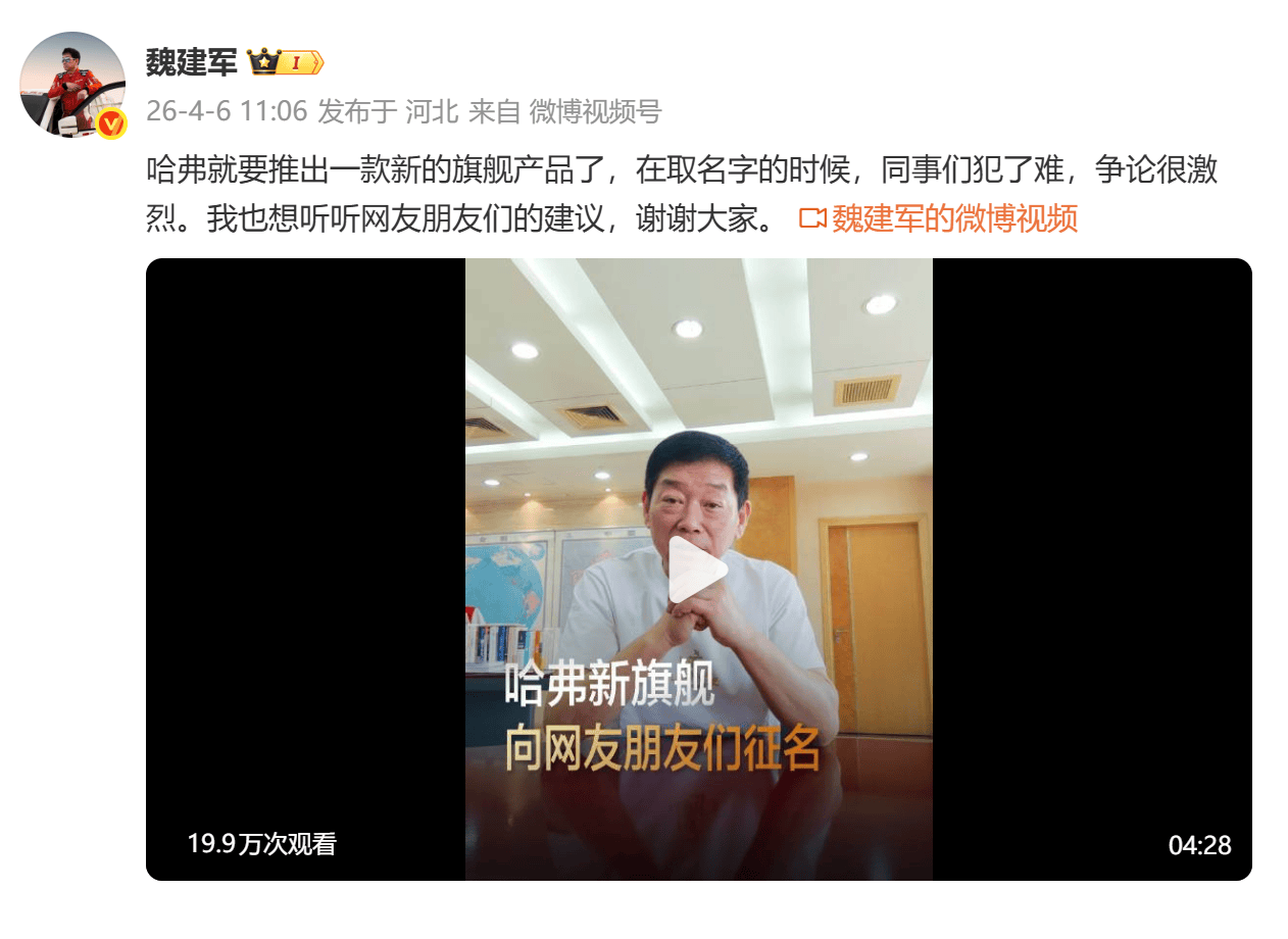 長城汽車董事長魏建軍在發布的視頻中透露,團隊內部對命名存在分歧:一派支持延續哈弗H系列經典命名體系的“H10”,另一派主張“HX”,以X寓意無限想象力。最終官方決定面向全網開啟全球征名活動,4月10日將篩選高熱度提名開啟最終投票。