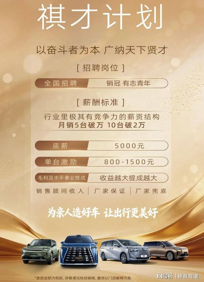 傳祺同步啟動的“祺才計劃”,面向全國高薪招募銷冠與行業有志青年,給出了行業極具競爭力的薪資結構:底薪5000元,單臺激勵800-1500元,月銷5臺收入即可破萬、10臺破2萬,再加上上不封頂的毛利及水平事業提成,直接把終端銷售的積極性拉滿。(具體以實際門店為準)