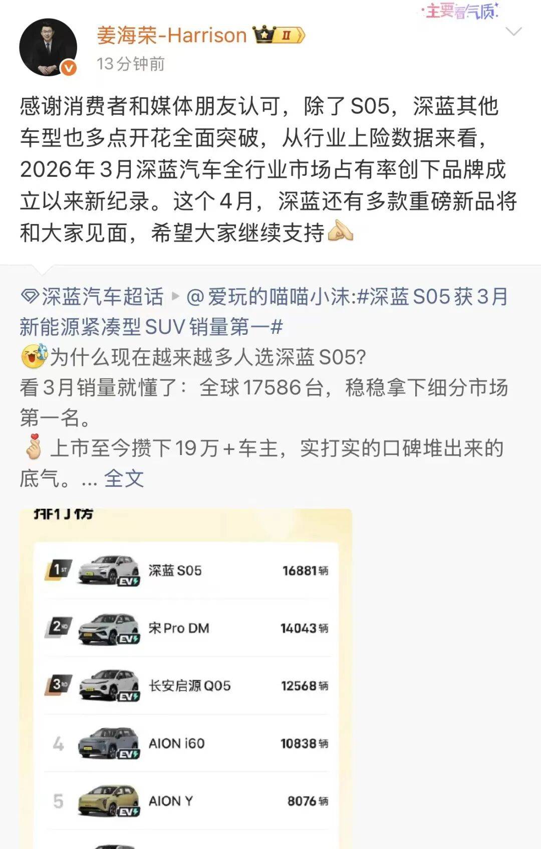 4月11日,深藍(lán)汽車CEO姜海榮在社交平臺轉(zhuǎn)發(fā)了一張“2026年3月全國新能源緊湊型SUV零售銷量排行榜”,深藍(lán)S05以16881輛的單月銷量,赫然位列榜首。姜海榮表示:“2026年3月,深藍(lán)汽車全行業(yè)市場占有率創(chuàng)下品牌成立以來新紀(jì)錄”,并透露4月還有多款重磅新品亮相。