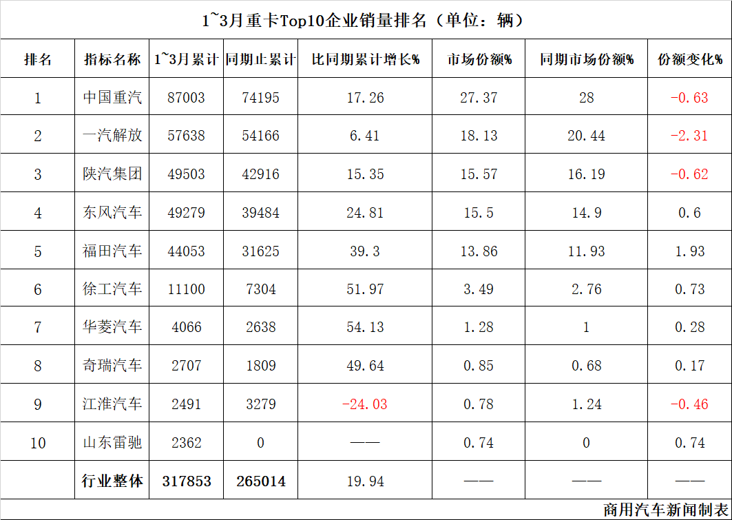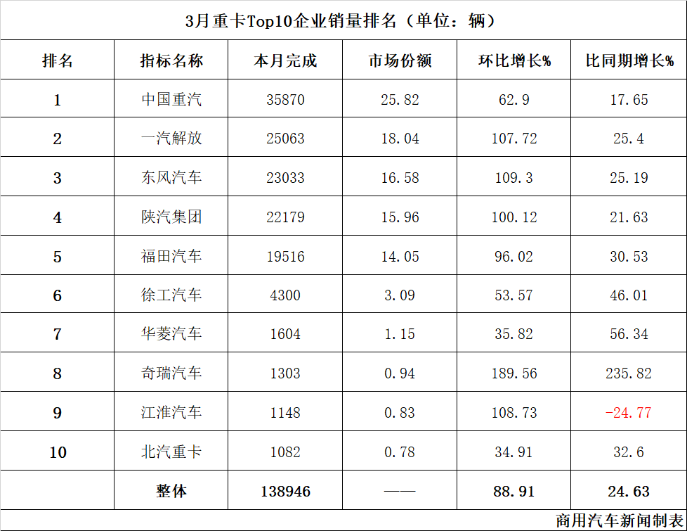 從同比變化角度分析,Top10企業“9增1降”,整體增長明顯。其中,奇瑞重卡增幅最大達到235.82%,另有6家企業增速高出市場大盤。不敵去年市場同期的僅江淮汽車一家,降幅為24.77%。