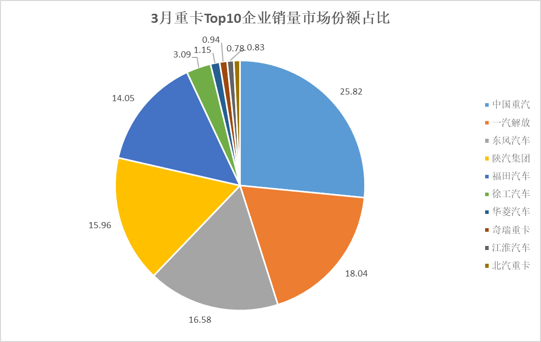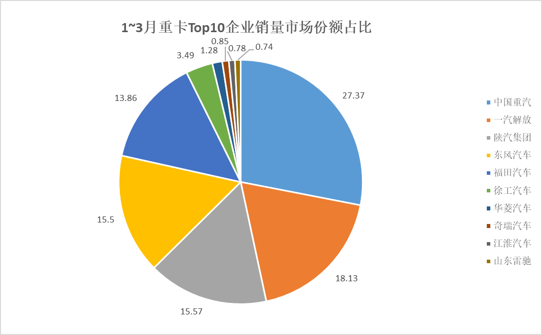 分企業來看,Top10企業“6增4降”,中國重汽份額下降較為明顯,達到4.12個百分點;一汽解放和東風汽車份額上升較大,分別增長了1.64和1.62個百分點。