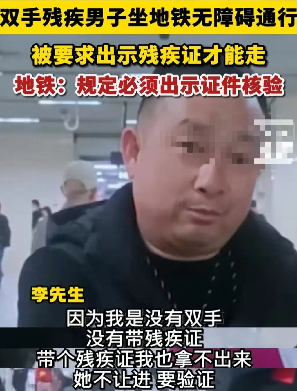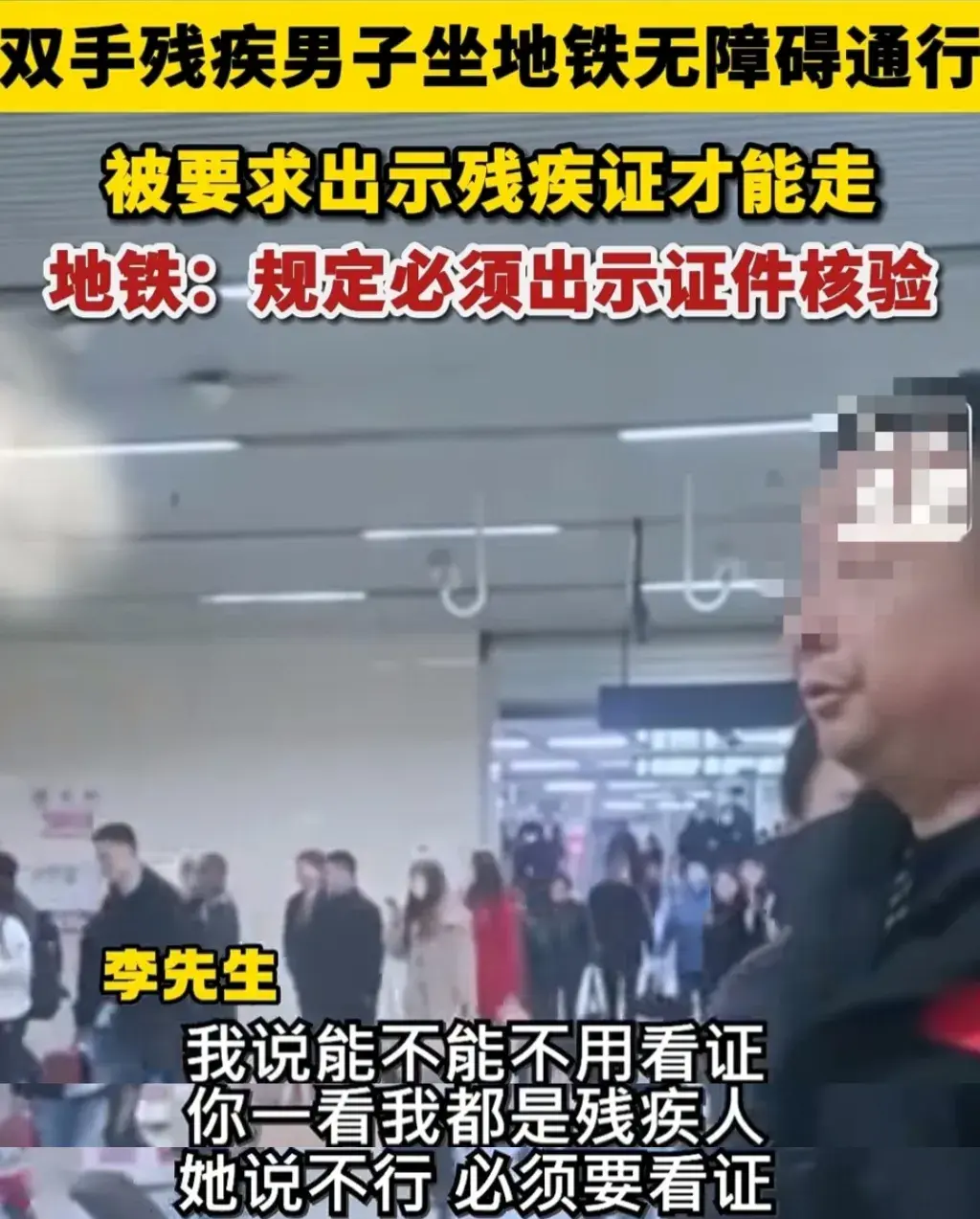 事發(fā)時(shí),李先生乘坐地鐵欲使用無障礙通道免費(fèi)通行,卻被地鐵的工作人員給攔下,要求其出示殘疾證。