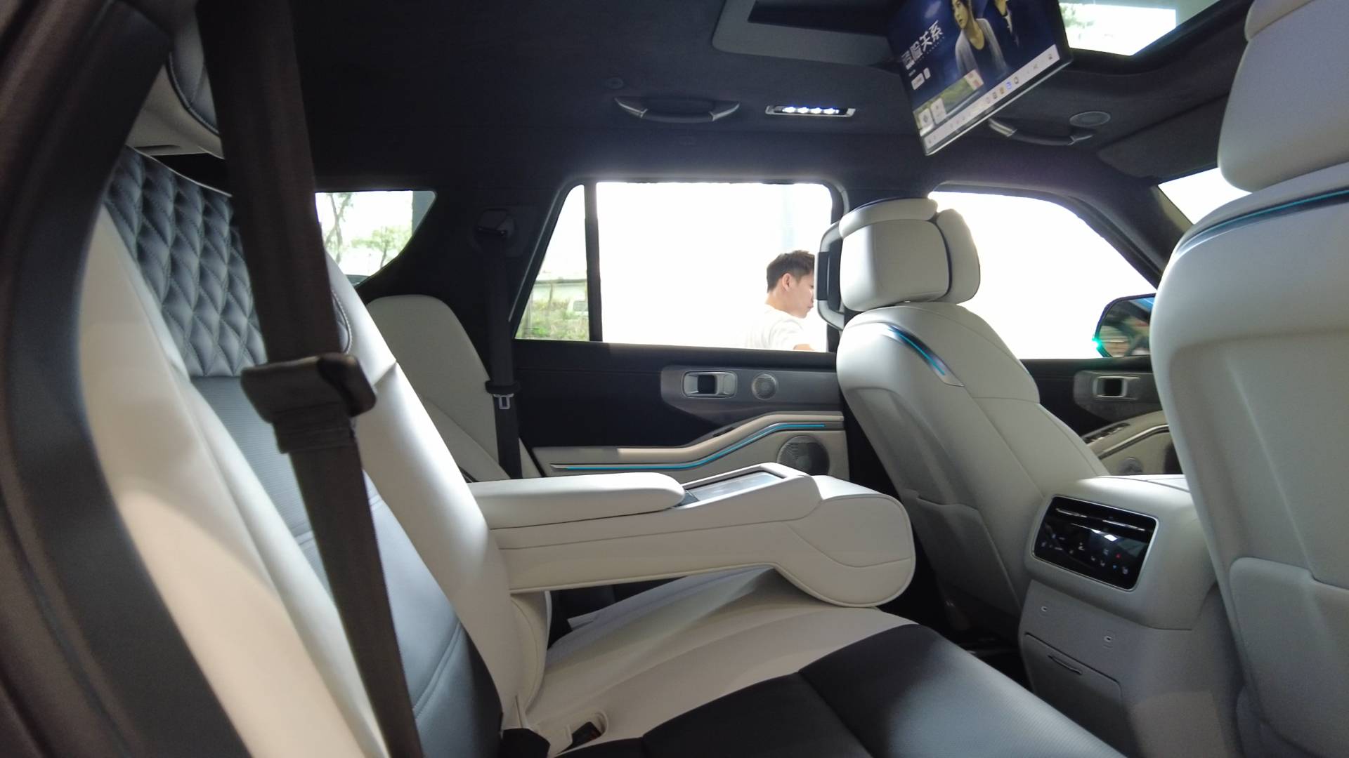 不過整個座艙就是主流的旗艦水平吧,雙17.3英寸中控屏幕+副駕娛樂屏+21.4英寸的后排吸頂屏,每個大屏各司其責服務每一個座位的乘客。
