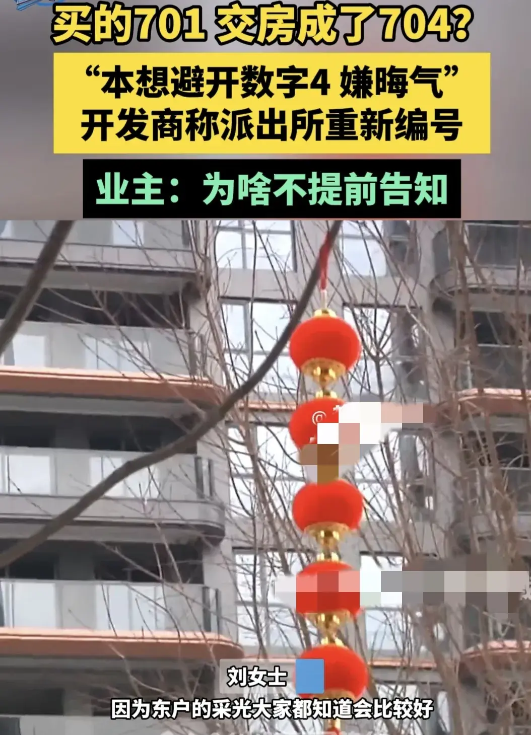 經(jīng)過一番糾結(jié),劉女士最終選擇了701。然而,交房時(shí)劉女士驚訝地發(fā)現(xiàn)事情并不如她所預(yù)期。原本的西戶701變成了704,更令人驚訝的是,每一層的01都統(tǒng)一變?yōu)榱?4。