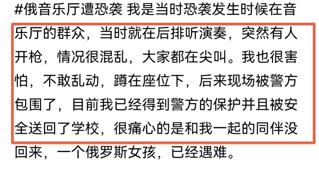 一名俄羅斯女子當時坐在觀眾席靠前的位置,暴徒沖進來后,一邊射擊一邊放火,他們還想把音樂廳的門鎖上,但沒有成功。