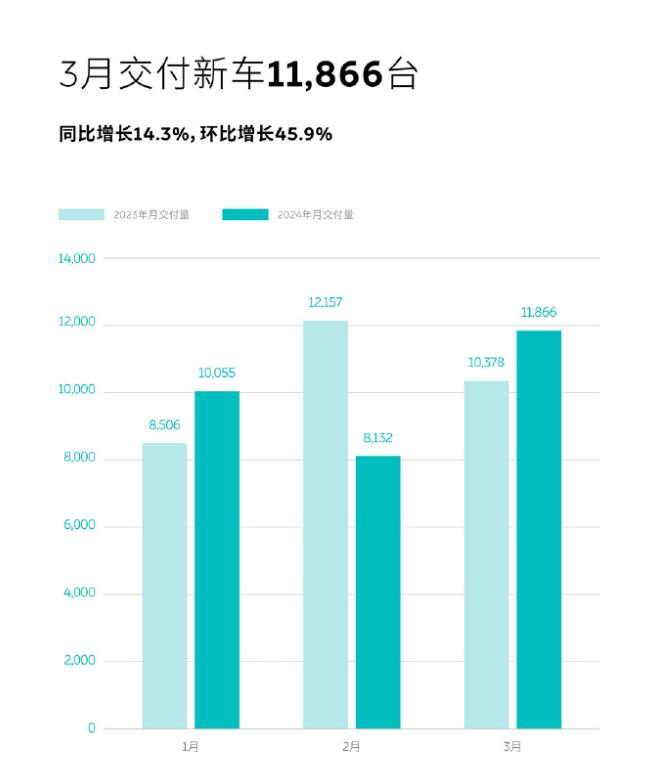 2024年,對于蔚來汽車而言,依然是壓力不小。在剛剛過去的3月份,蔚來的交付量沖破萬輛,數據顯示,3月份,蔚來汽車銷量11866輛,同比增長14.3%。據悉,蔚來汽車旗下第二品牌“樂道”即將于5月中上旬正式發布。