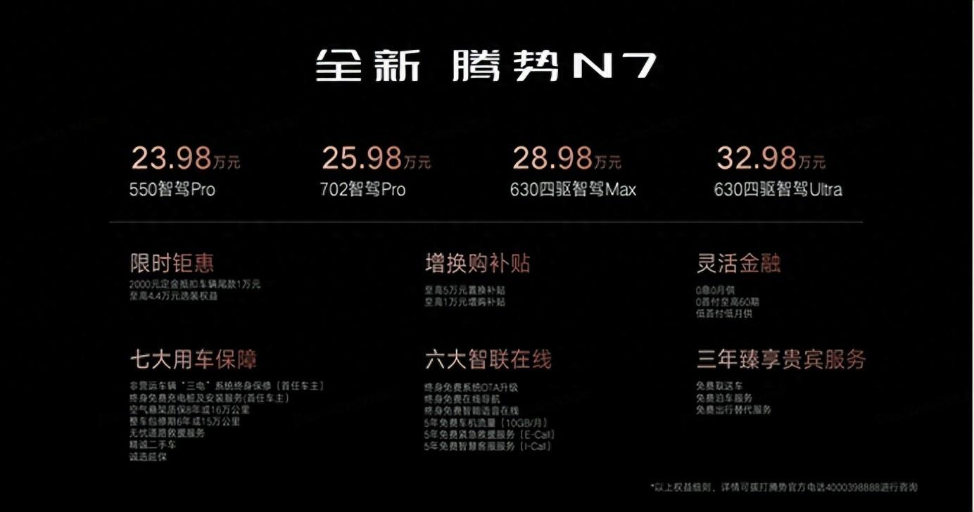 值得一提的是,即刻下定全新騰勢N7,可享定金2000元抵扣車輛尾款10000元上市權益。同時,為感恩回饋老用戶,騰勢汽車不僅推出了至高50000元的置換補貼,相當于0元換新,而且還有非常給力和周到的權益,讓老用戶買車更放心、換車更開心、用車更舒心。