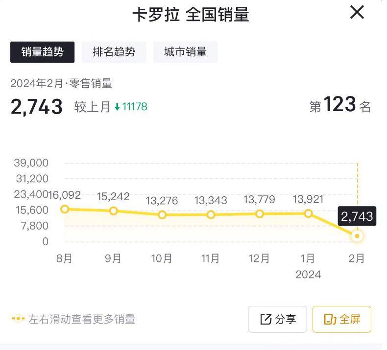 但是,2024年2月份,卡羅拉的銷量下滑較為嚴重。行業綜合銷量數據顯示,2024年2月份,卡羅拉的單月零售銷量為2743臺。