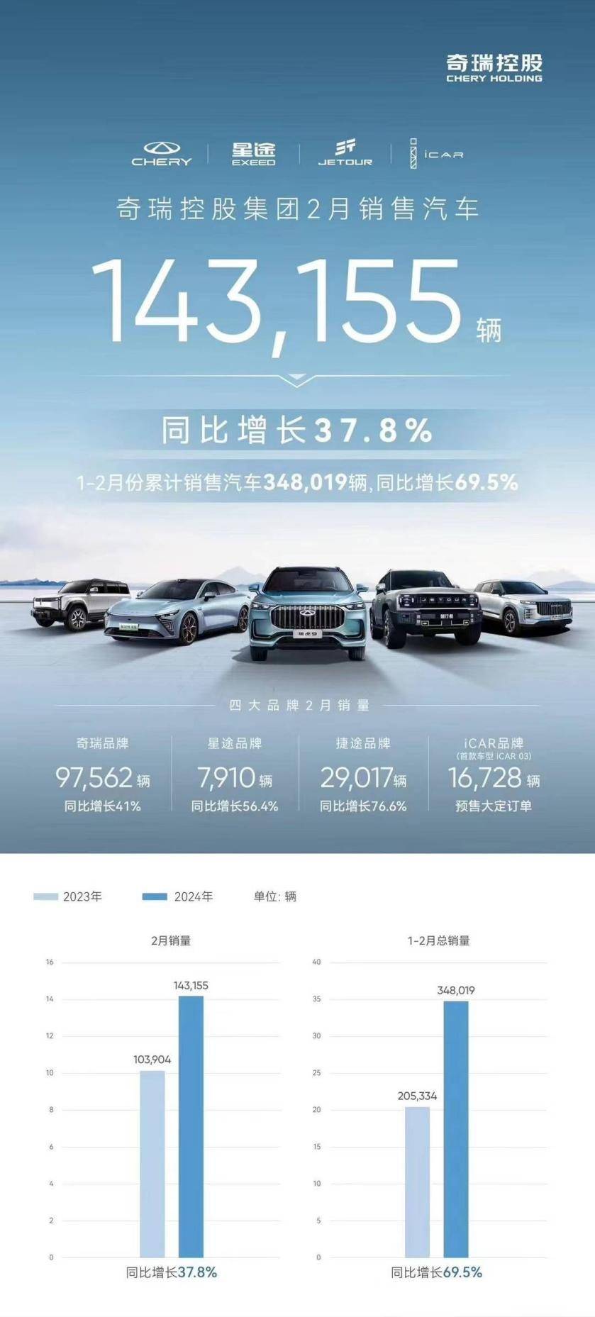 時光荏苒,就算是時間來到了「內(nèi)卷」更為嚴重的2024年,奇瑞的銷量增長態(tài)勢也依舊不減。在2024年1-2月份,奇瑞累計銷售汽車348,019輛,同比增長69.5%。其中2024年1月奇瑞集團銷量200,992輛,同比增長107.5%,連續(xù)第4個月單月銷量突破20萬輛。并且在2月份,奇瑞集團銷售汽車143,155輛,成為中國品牌汽車銷量第一。而繼3月30日發(fā)布風云A8遠航版之后,在4月2日,奇瑞控股集團也是發(fā)布了最新銷量快報。據(jù)悉,奇瑞集團3月份銷售汽車181,585輛,同比增長45.3%;至此,奇瑞一季度累計銷售汽車達到了529,604輛,同比增長60.3%。