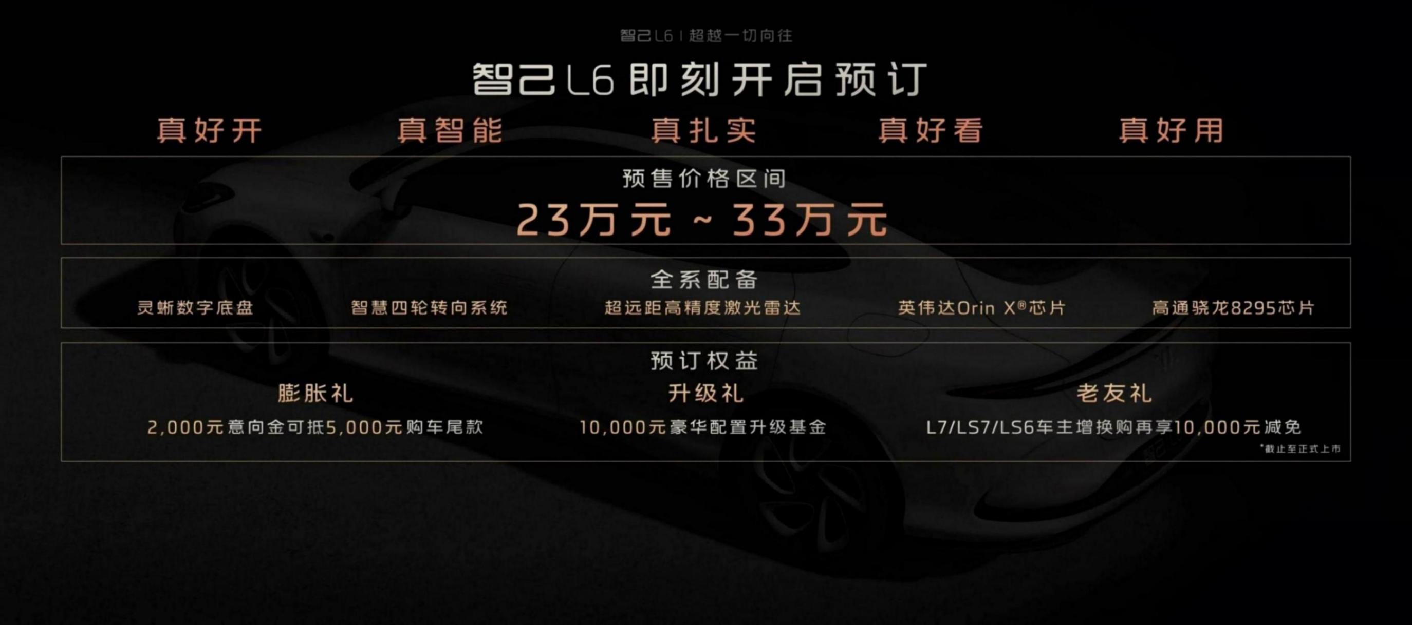 智己L6的預(yù)售價(jià)格區(qū)間為23萬元~33萬元,其中,標(biāo)準(zhǔn)版價(jià)格不超過23萬,性能版不超過29.99萬,最頂配的光年版不超過33萬,同時(shí)還有一些“限時(shí)預(yù)訂”促銷政策。
