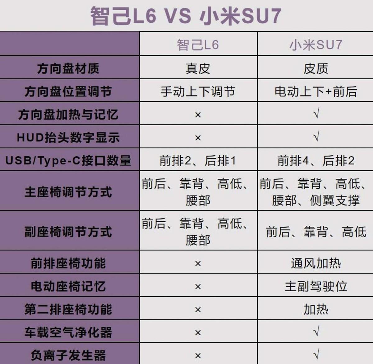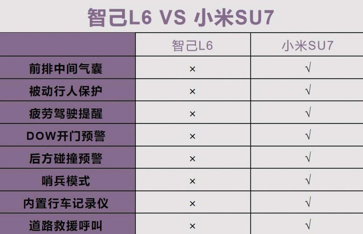 在主被動安全方面,依舊是小米SU7更豐富,比智己L6多了前排中間氣囊、疲勞駕駛提醒、哨兵模式、道路救援呼叫等,整體的安全性更高。