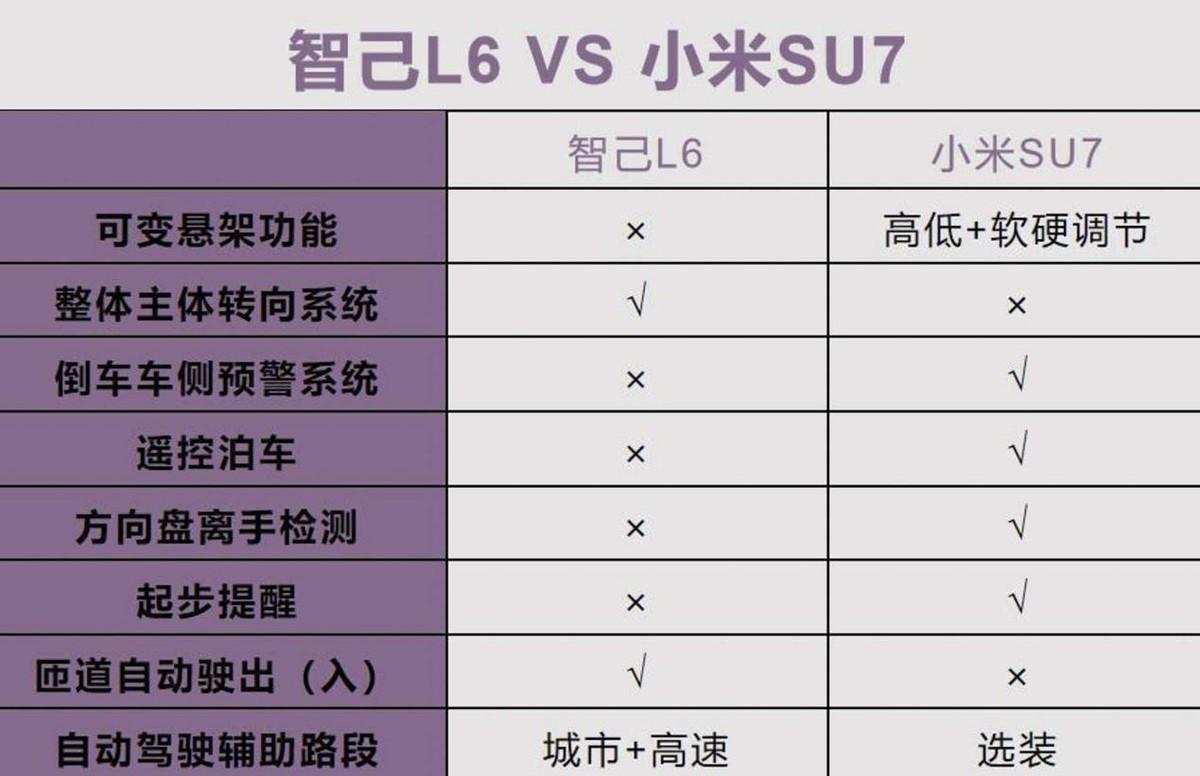 在輔助駕駛方面,兩款車也算是各有千秋,小米SU7的懸架支持高低和軟硬調(diào)節(jié),同時還有遙控泊車等功能,而智己L6則有整體主體轉(zhuǎn)向系統(tǒng)、自動駕駛輔助路段支持城市+高速,不過每個人的需求不一樣,所以不能簡單的說哪個功能好或者不好。