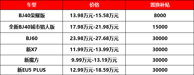 北京汽車“百億煥新,置換有禮”計劃,針對BJ60給到了至高3萬元的置換補貼,全新BJ40城市獵人版給到了至高15000元的置換補貼,BJ40榮耀版給出了至高8000元的置換補貼,是除舊車殘值、舊車補貼外,實實在在的額外的真金白銀給到用戶。