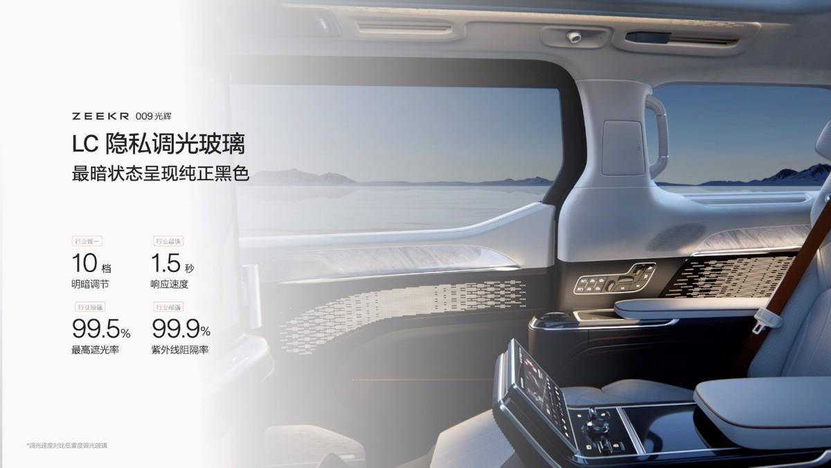 隱私保護,只有更安全。極氪聯合全球半導體顯示龍頭——京東方,共同開發行業內最先進的LC隱私調光玻璃,并在極氪009光輝全球首發搭載。行業唯一10檔明暗調節,透光度智能切換,最快調光僅需1.5s,比目前市面最好的EC光幕快40倍。在最暗狀態下,該光幕會呈現純正黑色,99.5%的最高遮光率,可與外界完全隔絕,全行業第一。這樣的黑科技,讓極氪009光輝,在全球所有高端出行產品中,成為了隱私安全的絕對標桿。
